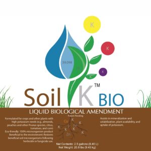 soil K™ BIO liquid is a consortium of seven strains of beneficial bacteria that function in all stages of the potassium cycle, including acting in the plant’s rhizosphere to solubilize organic potassium, making it easier for plants to absorb. This product also performs a broad spectrum of other nutrient and biological functions that support soil and plant health. Suitable for peach, cherry, plum, nectarine, and citrus production, almond, pecan, and pistachio crops, corn, and tomatoes.
